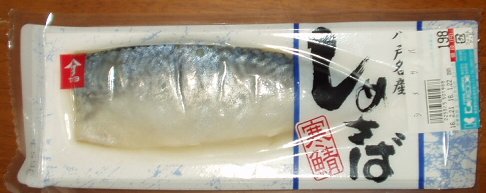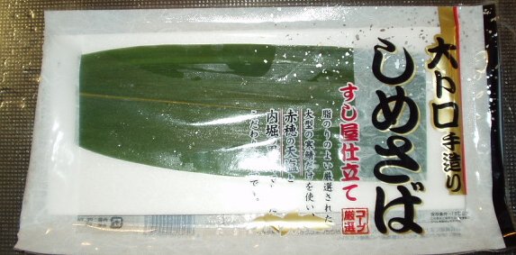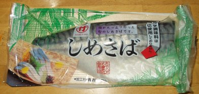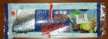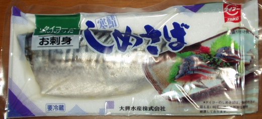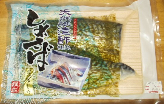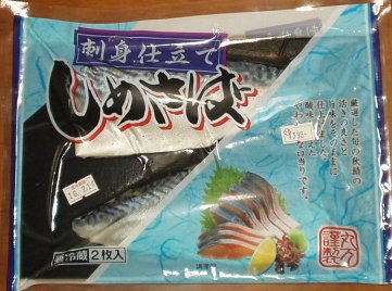 名古屋市内のスーパーヤマナカ | 379 | 2004 | 6 | 26 | A | 二枚のシメサバ、つまり一匹分のサバがパックされています。小型のサバのように思っていましたが、意外と大きなサバでした。ノルウエイサバであり、脂も十分のっていますが、エグイ感じはなくなかなか味付けも私好みでした。 今回昆布付きのものを購入しましたが、同価格で昆布の付いていないものもありました。 |