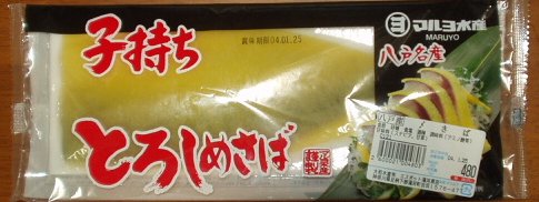 近所のスーパー | 480 | 2004 | 1 | 18 | A | シシャモの卵が板状に加工されたものが、シメサバの皮に沿って一面に貼られているものです。カズノコとシメサバを一緒に食べているような触感が楽しめます。このシシャモの卵の板が緩むことなくしっかりとくっついているのは何か特別な技術があるように感じます。 とてもユニークな商品ですが私は単にシンプルなシメサバの方が好きです。そこで一部このシシャモ卵を剥がして別々食べてみたところ、シメサバそのものもとても生っぽくて美味しいものでした。 |